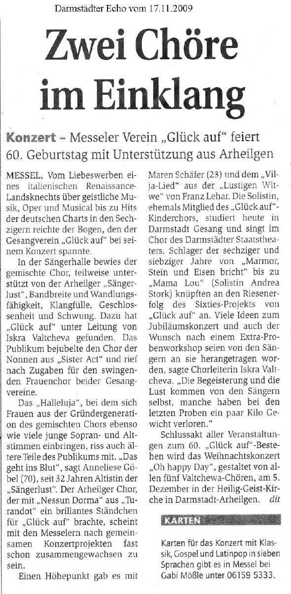 So nannten sich unsere Weihnachtskonzerte in Arheilgen und Michelstadt, die wir mit den Chören von der Sängerlust Arheilgen und dem Liederkranz Stockheim unter Mitwirkung des Pfungstädter Kinderchores, der SSG Steinbuch und der Solistin Maren Schäfer am 05. und 06.12. mit Erfolg absolviert haben. In beiden voll besetzten Kirchen konnten wir unser Publikum mit Weihnachtsmelodien aus der ganzen Welt in 7 Sprachen unterhalten und in vorweihnachtliche Stimmung versetzen. Dafür danken wir natürlich zuerst den überaus zahlreich erschienenen Besucherinnen und Besuchern und dann ganz besonders unserer Chorleiterin Iskra Valtcheva, der es gelungen war, in nur wenigen Probenstunden die Chöre zu mehreren gemeinsamen Liedern zusammenzuführen und diese Konzerte von Ablauf und Choreografie her perfekt zu organisieren und zu arrangieren. Dafür ein herzliches Dankeschön an Iskra Valtcheva und auch von dieser Stelle noch mal nachträglich ganz herzliche Glückwünsche zu ihrem Geburtstag, den sie am Konzertsamstag in Arheilgen feiern konnte. Ein ganz großes Dankeschön auch an unsere fleißigen, engagierten Sängerinnen und Sängern, die trotz des vorhergehenden Abschlusskonzertes zum 60-jährigen Bestehen des Vereins es sich nicht nehmen ließen, auch diese 2 Konzerte mit Begeisterung und Empathie anzugehen. Damit hat das Jahr unseres Jubiläums einen überaus würdigen und gelungenen Abschluss gefunden.